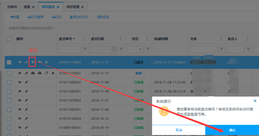 在操作栏点击<审核>按钮,便会弹出审核提示框,点击确认后审核成功并且会生成盘盈盘亏单,盘点结束。