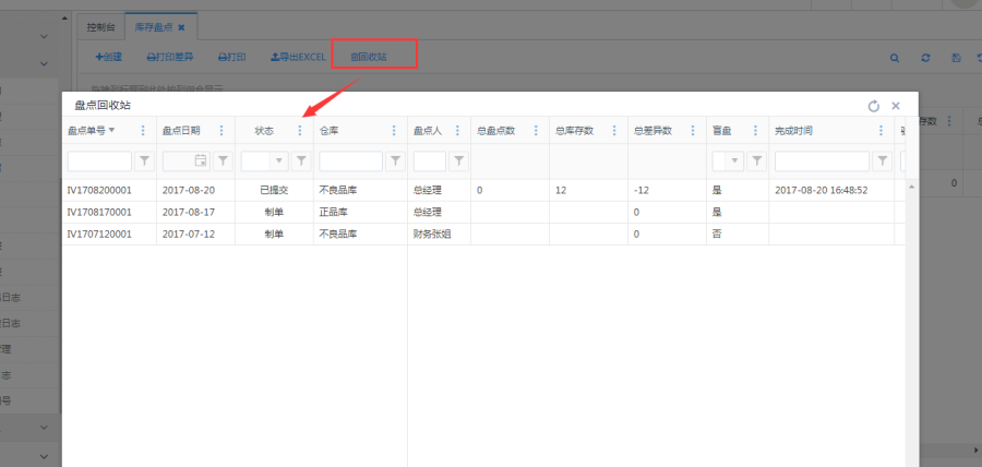 点击列表上方回收站按钮,弹出框中可查看删除的盘点单的历史记录,被删除的订单只能查看不能恢复,如果误删了订单,只能重新新建。
