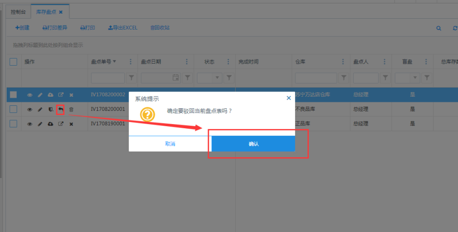 已提交状态的盘点单,可以点击操作栏的<驳回>按钮,驳回当前盘点单,驳回后的盘点单可以进行修改,删除,提交盘点等操作。重新提交盘点单后才改变驳回状态。