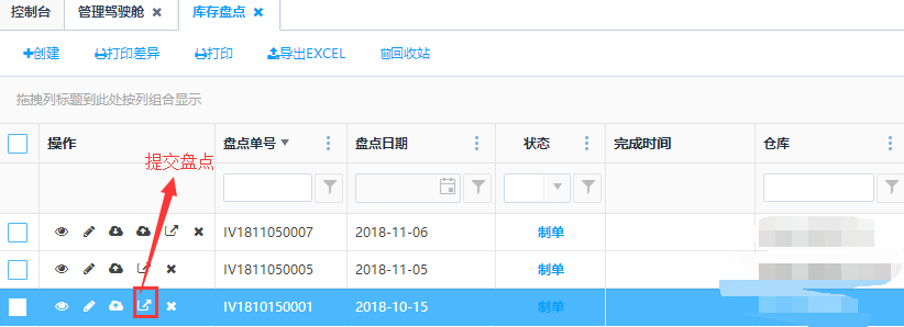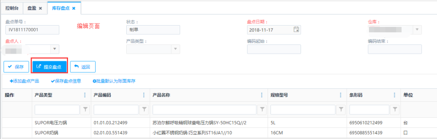 制单状态的盘点单,仓库盘点产品信息结束后可提交盘点单,可点击操作栏的<提交盘点>或者点击编辑页面的<提交盘点>按钮,对盘点点进行提交操作,提交后不能进行修改。