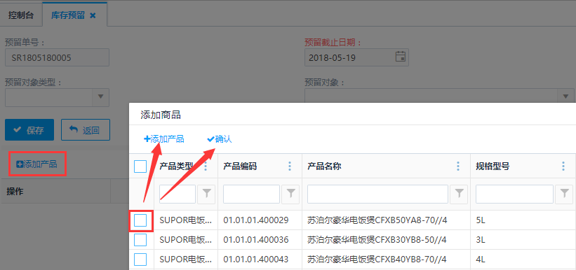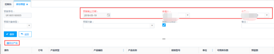 第二步:选择【预留截至日期】、【申请人】、【仓库】后点添加产品。