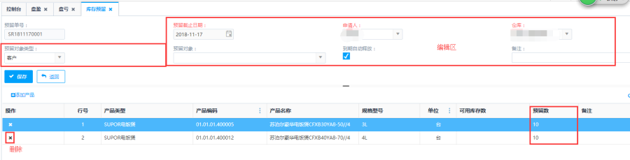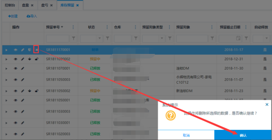 制单状态的库存预留单,可点击操作栏的<删除>按钮进行删除操作。