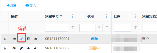 制单状态的库存预留单,如需修改单据内容,可点击操作栏的<编辑>按钮进行修改。