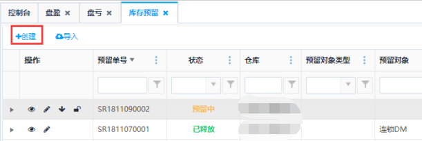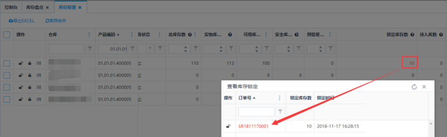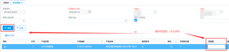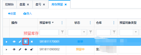 制单状态的库存预留单,可点击操作栏的<预留库存>按钮进行预留库存操作,预留库存操作成功后在库存管理中可以查看该产品锁定的库存数。