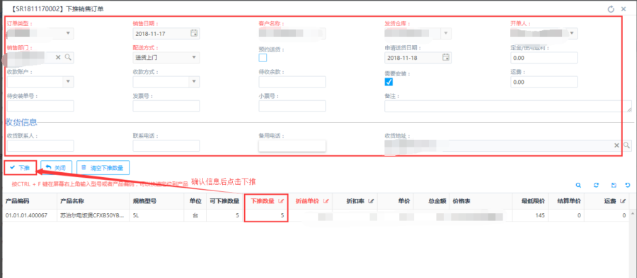 以下推销售订单为例:选择下推订单类型为销售订单,跳转到销售订单页面。确认信息无误后,点击<下推>按钮,下推成功后会在销售订单中生成一条销售订单记录。