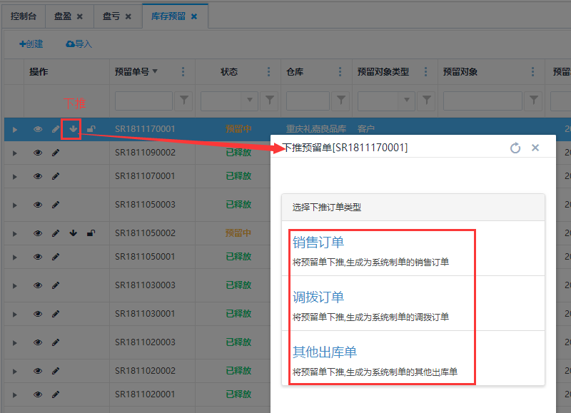对于【预留中】状态的单据,可下推销售订单、调拨订单和其他出库单。点击列表操作栏的<下推>按钮,根据需求选择下推订单类型,然后进入下推销售/调拨订单/其他出库页面。