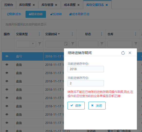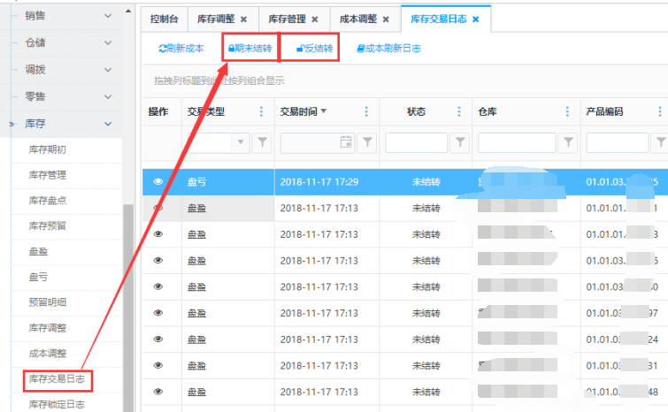 - 库存交易日志显示所有使库存发生变动的订单记录。