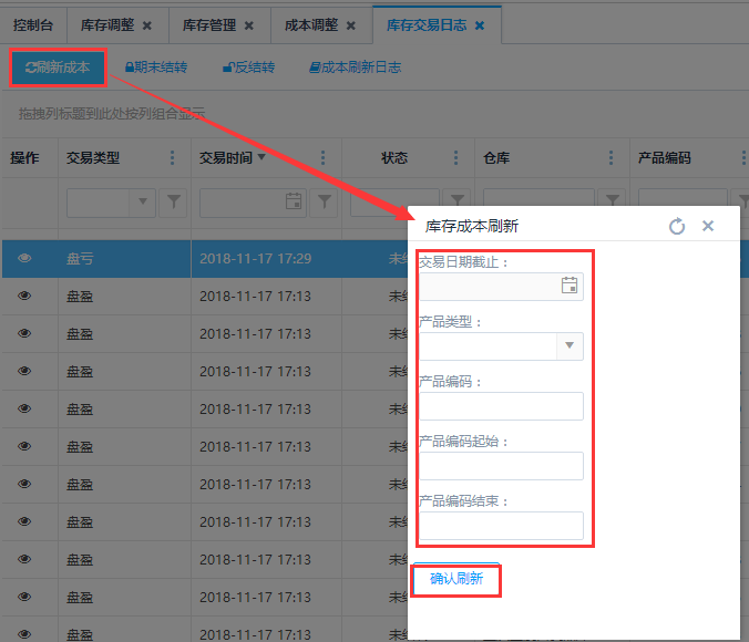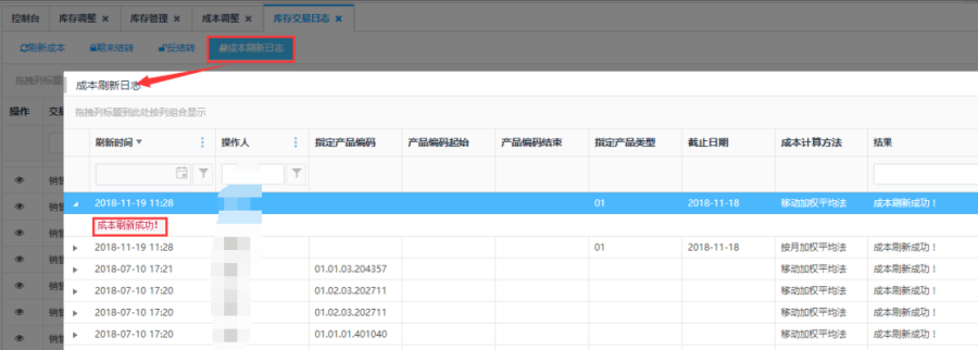 点击<刷新成本>弹出信息选择框,进行选择后点<确认刷新>,刷新成功后可以去<成本刷新日志>处查看刷新成功日志