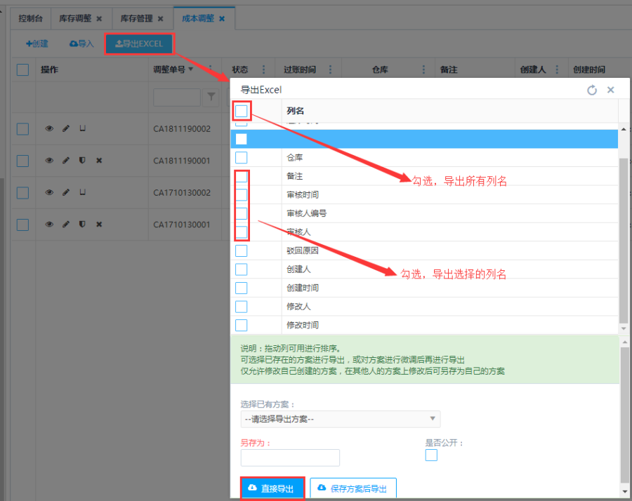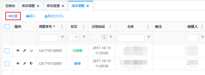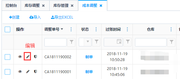 点击列表上方的<导出EXCEL>按钮可导出成本调整列表内容。