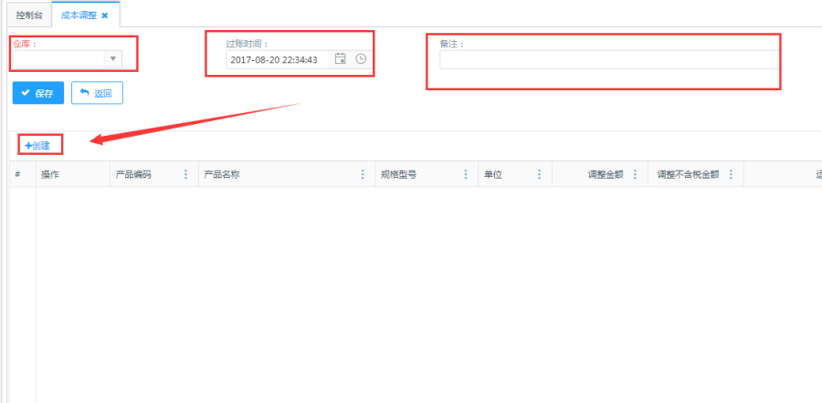 第二步:选择【仓库】、【过账日期】填写【备注】后点创建。
