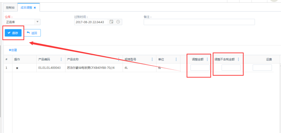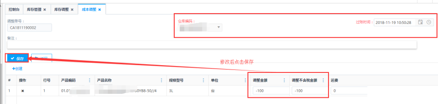 - 成本调整单中数值填正数代表该产品的库存成本增加等额的成本金额;反之,填写负值代表减少;如:填写1000代表成本增加1000;-1000代表成本减少1000。