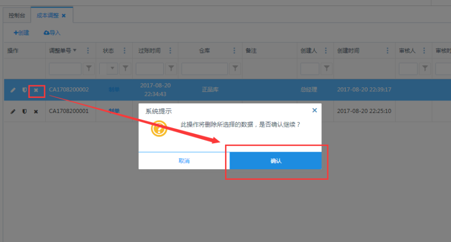 制单状态的成本调整单,在操作栏点击<删除>按钮,便会弹出删除提示框,点击确认即可删除。