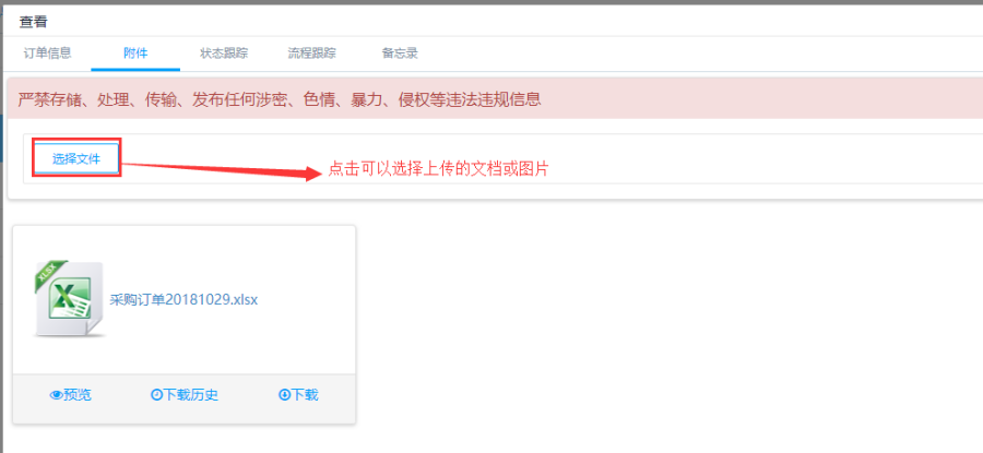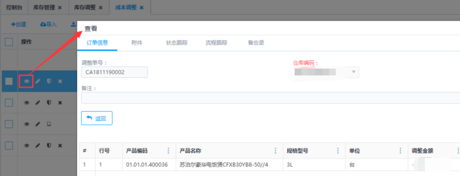 所有状态的订单,点击<查看>按钮,查看当前成本调整单信息详情。界面内容:订单信息、附件、状态跟踪、流程跟踪、备忘录等相应的单号信息;