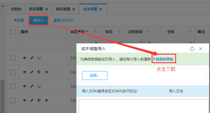 第一步:点击<导入>弹出导入框:然后下载最新模板后按模板格式进行数据维护: