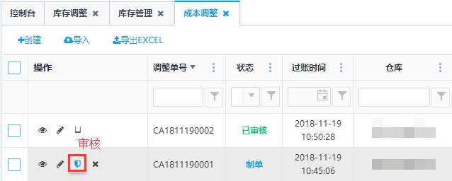 制单状态的成本调整单,在操作栏点击<审核>按钮,提示审核成功,单据状态变为"已审核"。