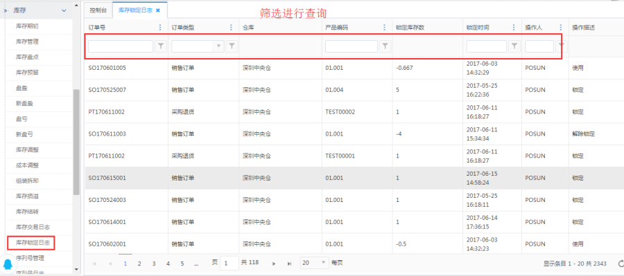 显示锁定的库存记录,可进行筛选查询。