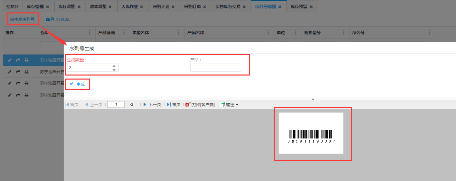 点击列表上方的<生成序列号>按钮,弹出生成序列号界面,输入生成数量,点击<生成>,下列空白处会生成序列号条码。