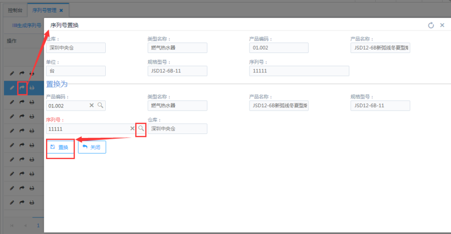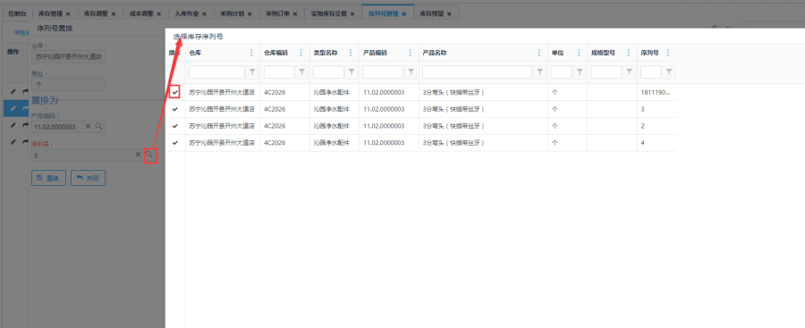 - 操作序列号修改与置换后并没有立即生效,而是会在【进销存-库存-库存调整】中生成库存调整单,把该单据审核后方会生效。