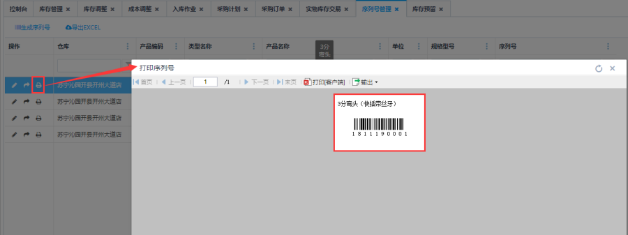 在左侧操作栏,点击操作栏的<打印>按钮后弹出打印框。打印预览界面点击<打印客户端>,完成打印序列号操作。