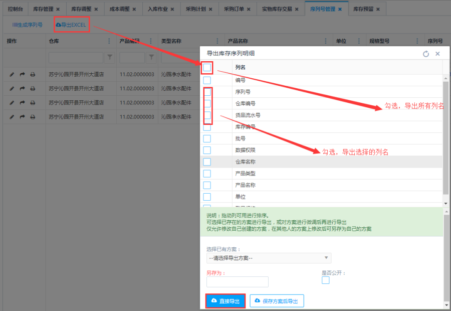 点击列表上方的<导出EXCEL>按钮可导出系列号管理列表内容。