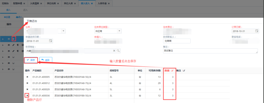 第二步:维护即将下推的单据信息,填写还出数量后点击<保存>按钮