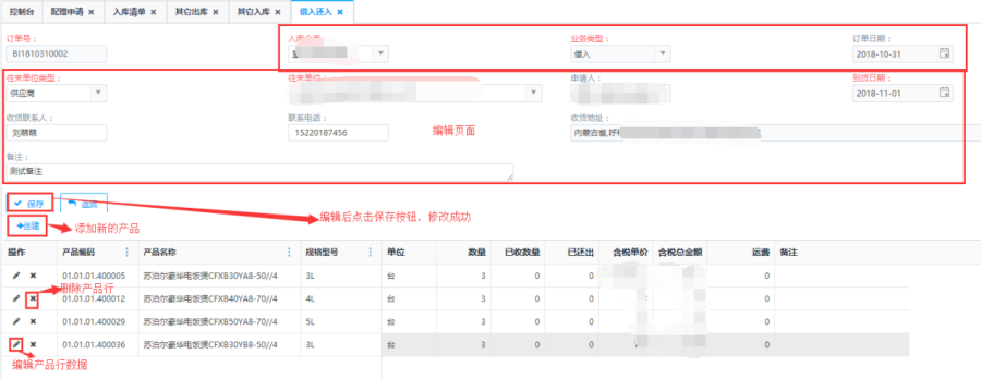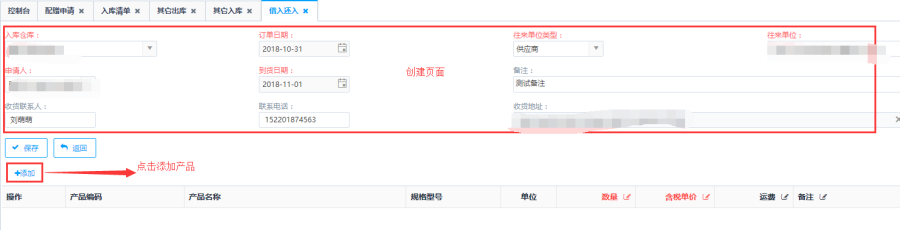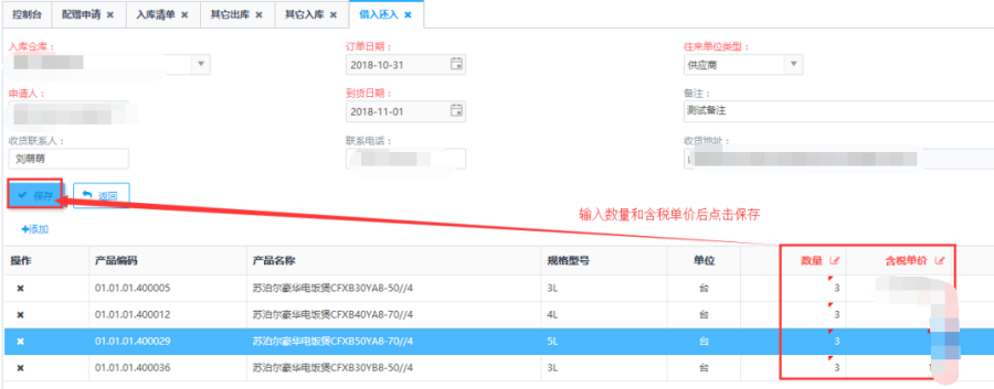 第四步:填写订单的产品【数量】和【含税单价】后点击<保存>后返回借入还入主页面。
