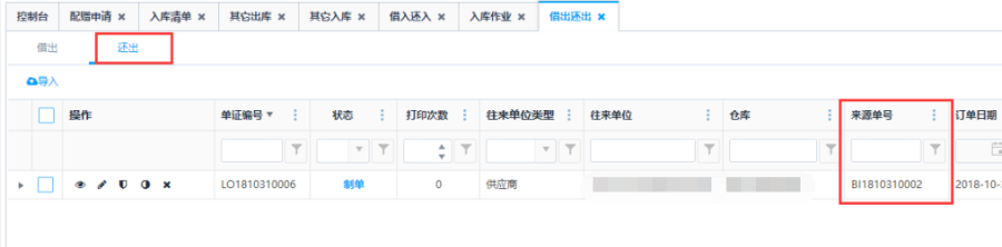 第三步:下推还出的订单在【进销存-其它出入-借出还出】中查看。