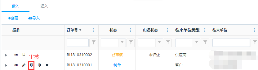 制单状态下的订单,可以点击操作栏中的<审核>按钮,可以对订单进行审核操作,审核后生成入库作业单。