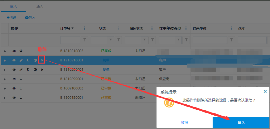 制单状态下的订单,可以点击在操作栏的<删除>按钮,便会弹出删除提示框,点击确认即可删除。