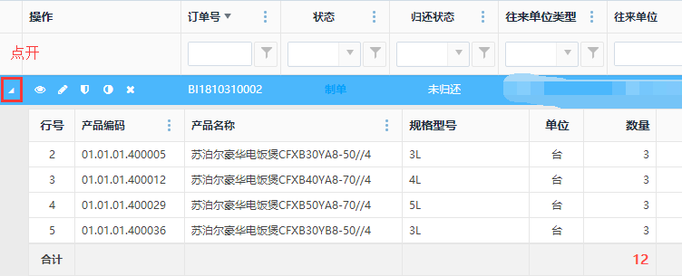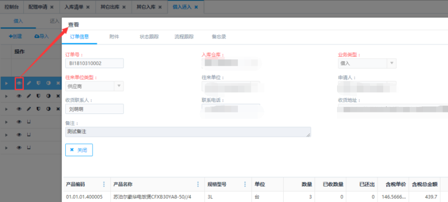 所有状态的订单,点击<查看>按钮,查看当前借入还入信息详情。界面内容:订单信息、附件、状态跟踪、流程跟踪、备忘录等相应的单号信息;也可以点击最左端的三角形按钮,直接查看订单的产品明细。