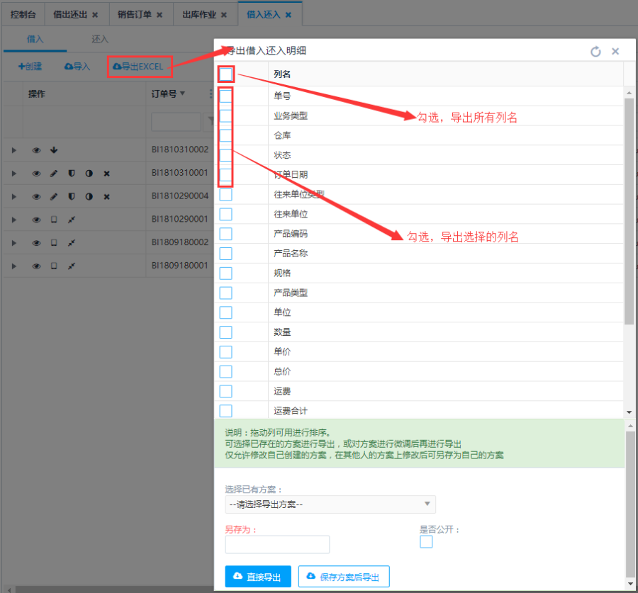 点击列表上方的<导出EXCEL>按钮可导出借入还入列表内容。