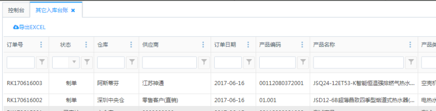 其它入库台账这里显示每一条其它入库的产品信息,可在此页面查询台账。