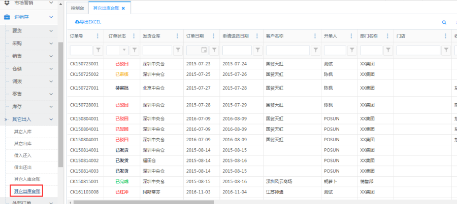 点击列表上方的<导出EXCEL>按钮可导出其它出库台账列表内容。