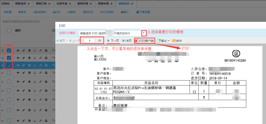 第一步:在左侧多选框,选中销售退货单,再点击列表上方<打印>按钮后弹出打印框。