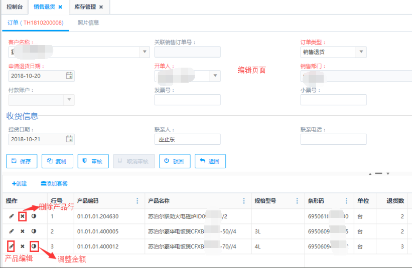 制单状态下的销售退货单,可点击操作栏中的<编辑>按钮,可对销售退货单进行编辑操作.