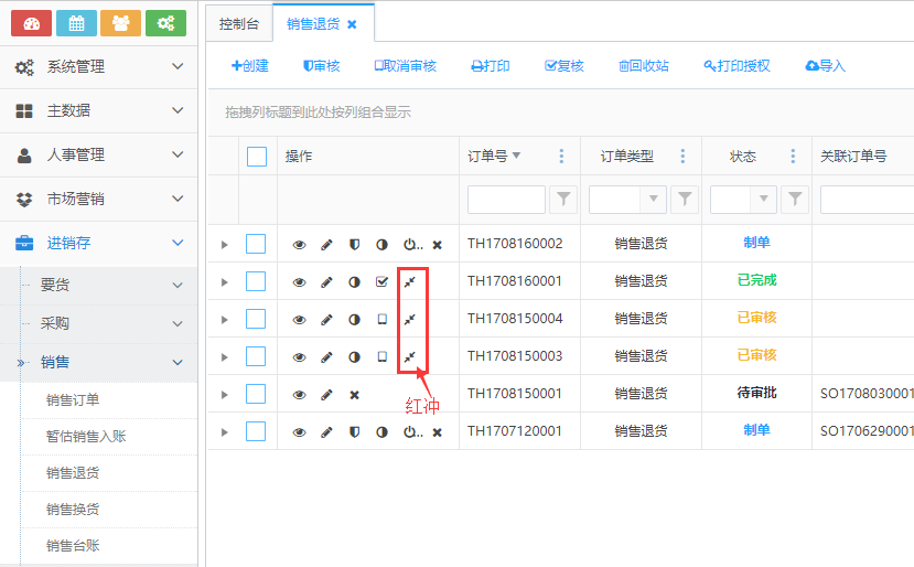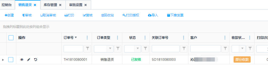 - 审核:制单状态下销售退货单,审核该销售退货单,审核后审核按钮置灰,不能点击;取消审核可点击操作;