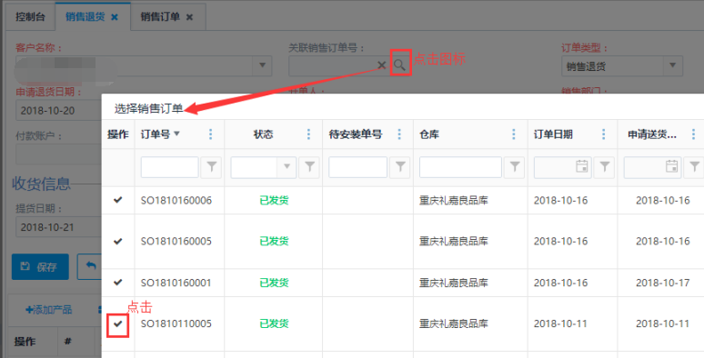 第二步:编辑销售退货订单内容,点击关联销售单号,选择需要进行退货的销售订单,选择后,产品列表自动带出订单产品明细: