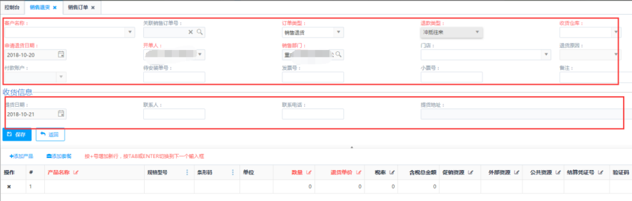 第二步:编辑销售退货订单内容,不关联销售订单号,点击<添加产品>按钮添加销售退货订单产品明细:
