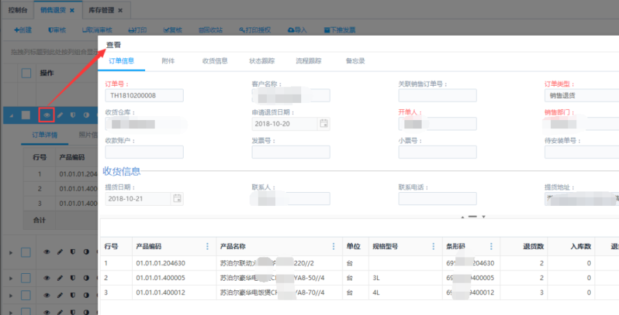 所有状态的订单,点击<查看>按钮,查看当前销售退货信息详情。界面内容:订单信息、附件、收货信息、状态跟踪、流程跟踪、备忘录等相应的单号信息;也可以点击最左端的三角形按钮,直接查看订单的产品明细。