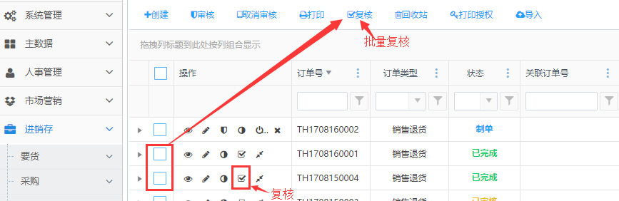 "已完成"状态的销售退货单,选择需要复核的单,点击<复核>按钮或者点击左边勾选框勾选多条产品数据,点击上方列表中的<复核>按钮,对订单进行批量复核操作。订单变为"已复核"状态。