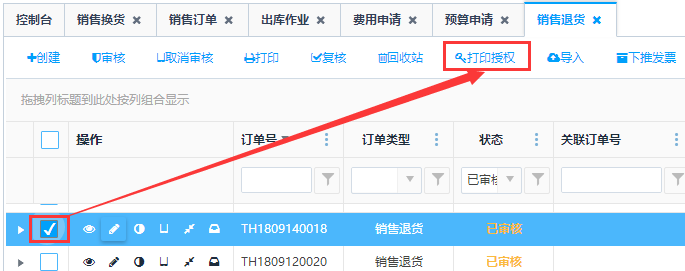 当单据超过限定的打印次数后,想再次打印时,勾选单据后点击<打印授权>后方可打印。