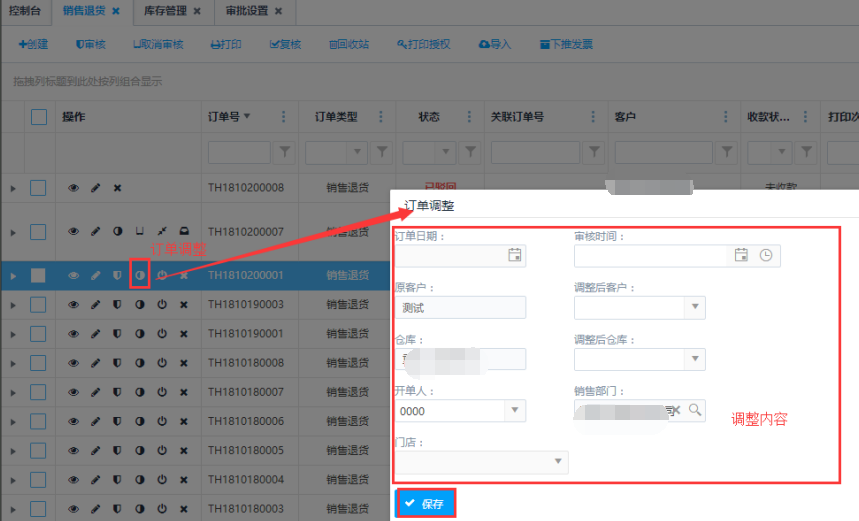 制单/已审核/已完成状态的销售退货单,点击操作栏中的<订单调整>按钮,可以对订单进行订单调整操作。