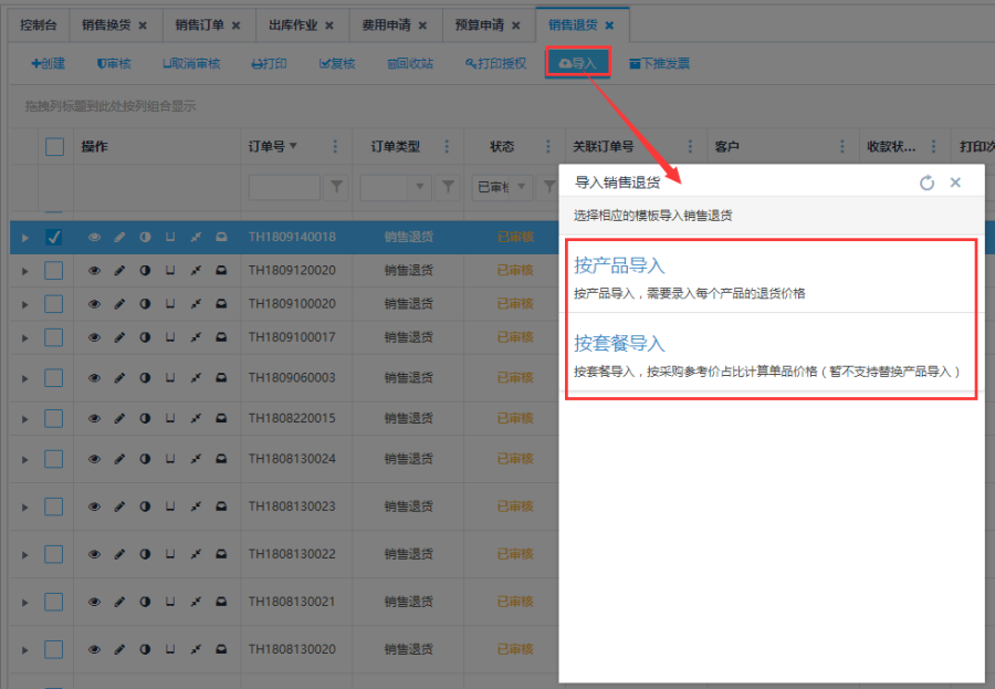 当销售退货单数量多的时候可导入数据并且批量创建销售退货单。