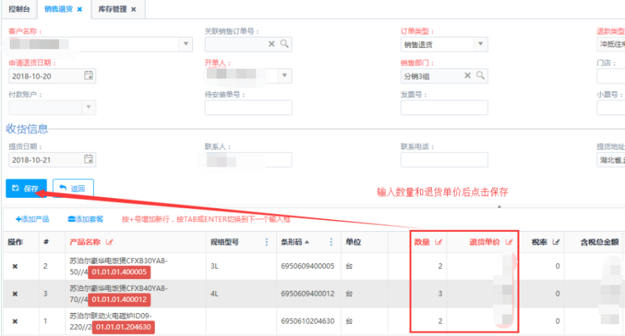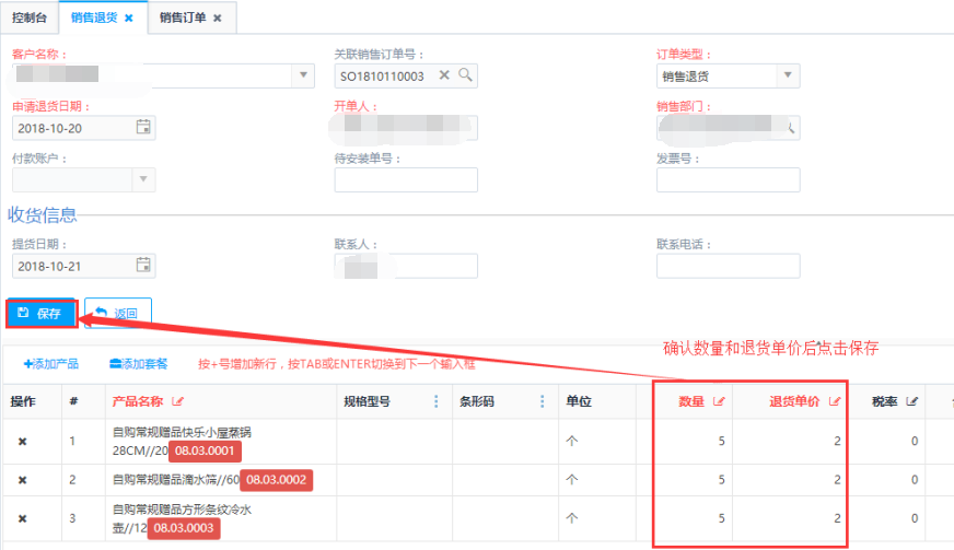 第三步:补全订单产品明细信息,点击<保存>按钮,完成销售退货单创建。