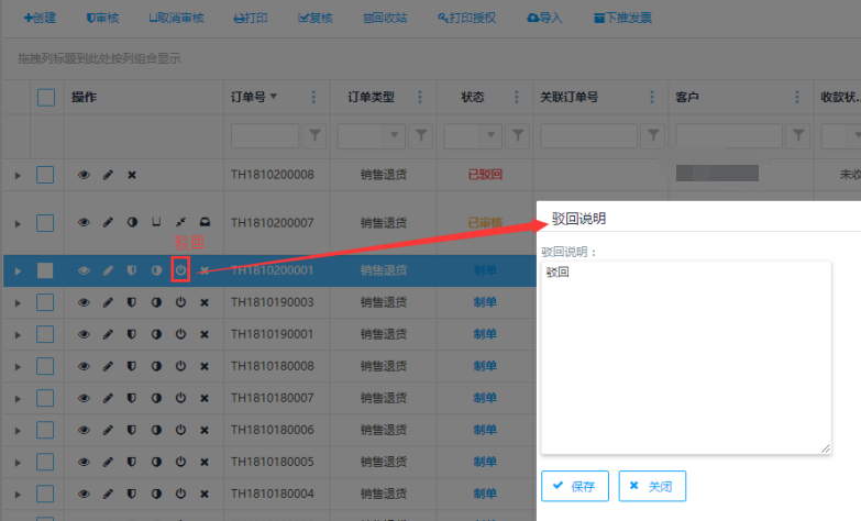 制单状态的销售退货单,可以在操作栏点击<驳回>按钮或者编辑页面的<驳回>按钮,完成驳回操作,单据状态显示"已驳回"