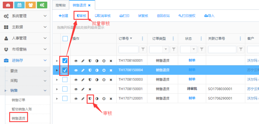 状态为制单的订单,可在销售退货首页操作栏点击<审核>,或点击左侧多选框选中多个销售退货单后,再点击列表上方<审核>按钮批量完成审核。