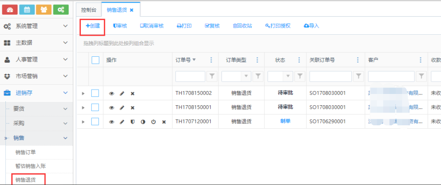 第一步:点击列表左上方<创建>按钮,进入销售退货的创建页面: