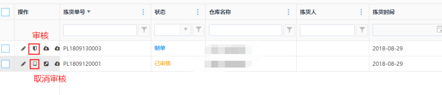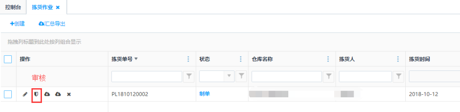 状态为制单的订单,可在拣货作业首页操作栏点击<审核>,对订单进行审核操作,拣货单审核后,状态转为"已审核"。