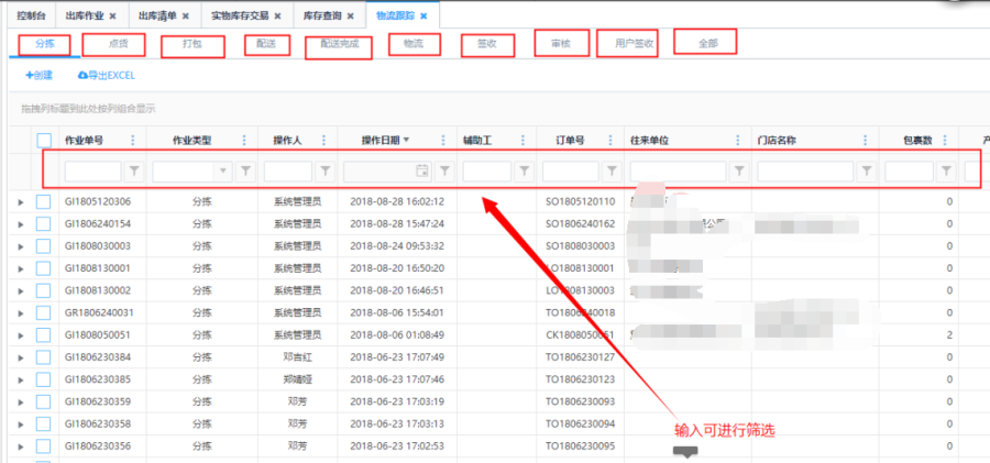 分为【分拣】、【点货】、【打包】、【配送】、【配送完成】、【物流】、【签收】、【审核】、【用户签收】、【全部】几个流程的订单,可进行筛选查询。
