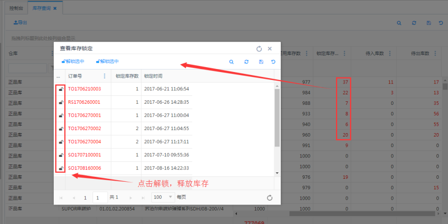 点击红色数字可查询库存锁定的单据,对于锁定的库存可点击<解锁>释放给其它加急的单据使用;除【锁定库存数】红色数字可解锁外,其它均只提供查看。